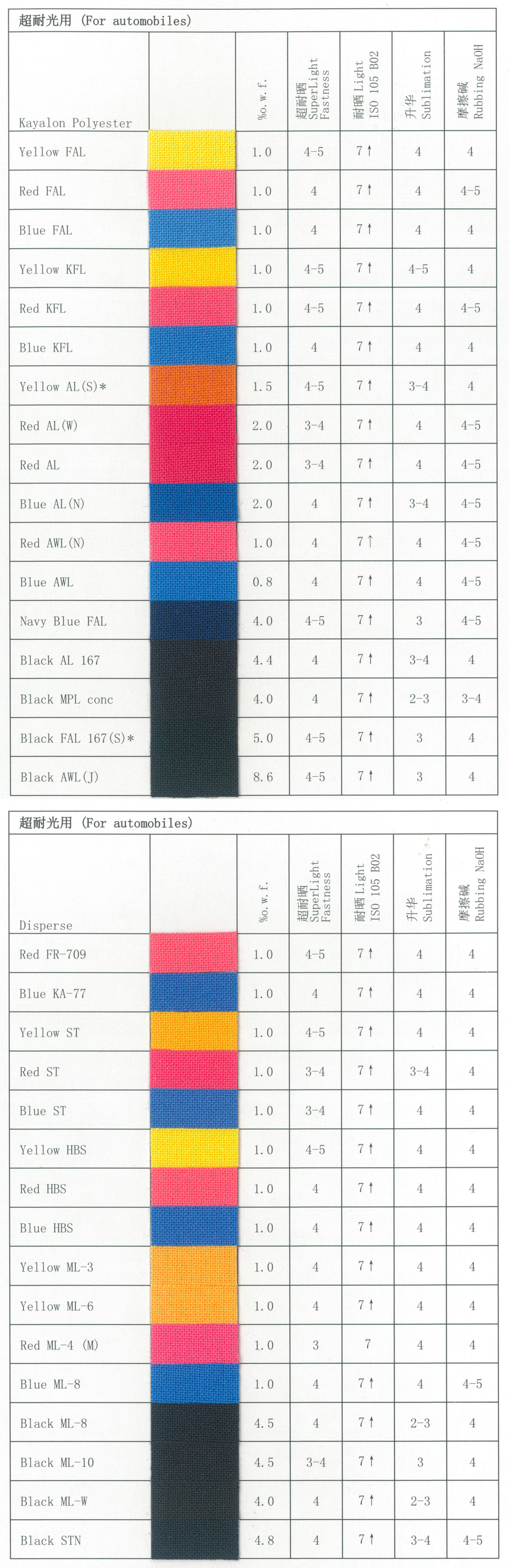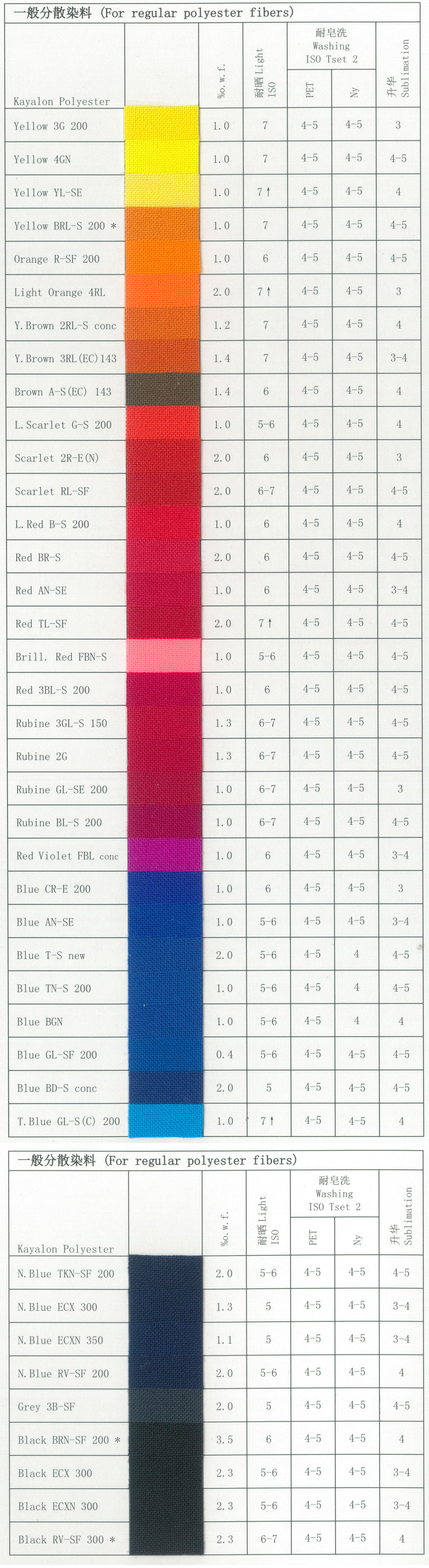 Kayalon Polyester Colours: 一般分散染料、超耐光用分散染料
